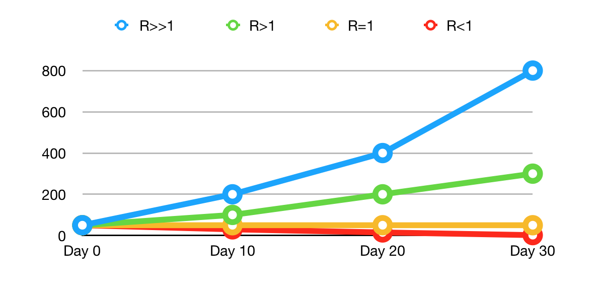 If you go back to your middle school math, the basic equation for a line is y=mx+b, where “m” is the slope of the line. While the epidemiological math is non-linear (and complicated by the rate of cure vs new-infection), R is basically “m” (or the slope of the infectious curve graph). When R >1 the slope is positive, when R=1 the slope is 0 (flat) and when R<1 the slope is negative. If R is 2 the cases will follow the following pattern 1 : 2 : 4 : 8 : 16 : 32 : 64 : 128 : 256 : 512 : 1,024.